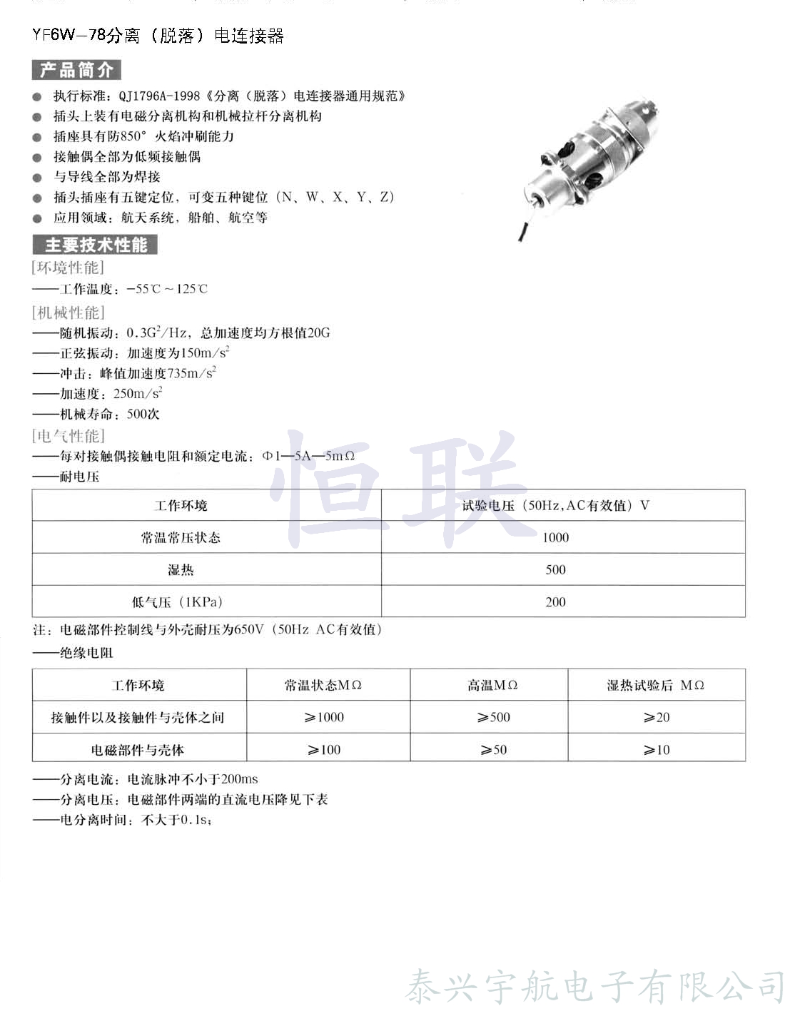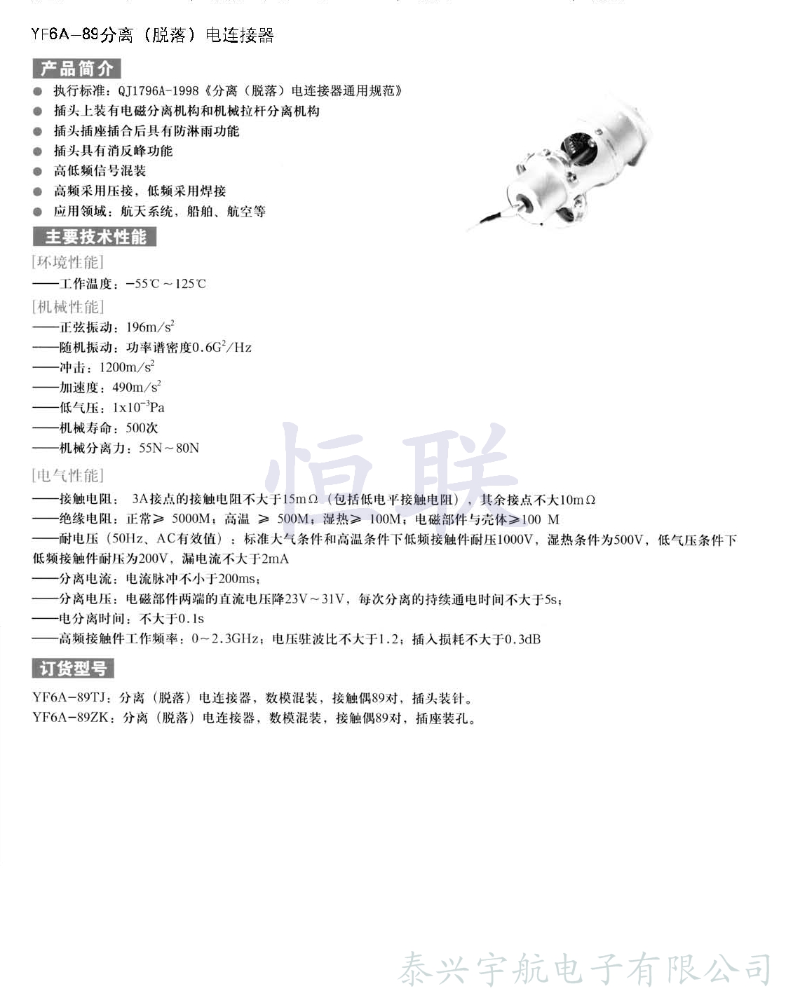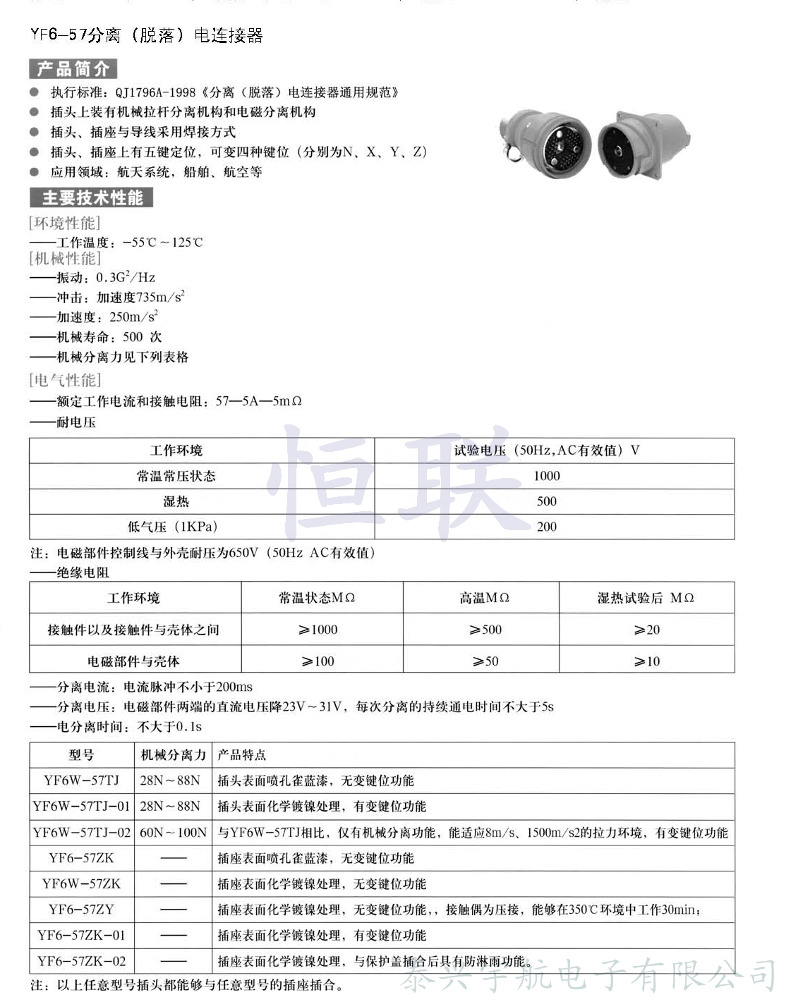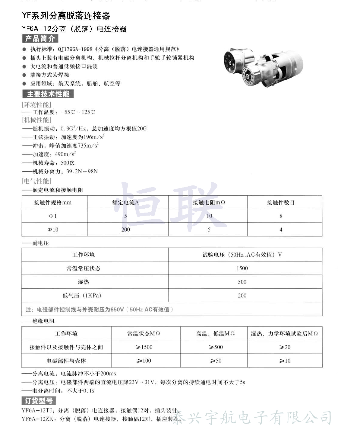 YF型圓形分離電連接器適用于具有小型化要求的戰(zhàn)略戰(zhàn)術(shù)武器系統(tǒng)、航天運載系統(tǒng)的級間電氣線路連接和系統(tǒng)與地面設(shè)備的電路連接,以及其他工業(yè)設(shè)備的電氣連接,并可做瞬間電磁分離和機械分離。