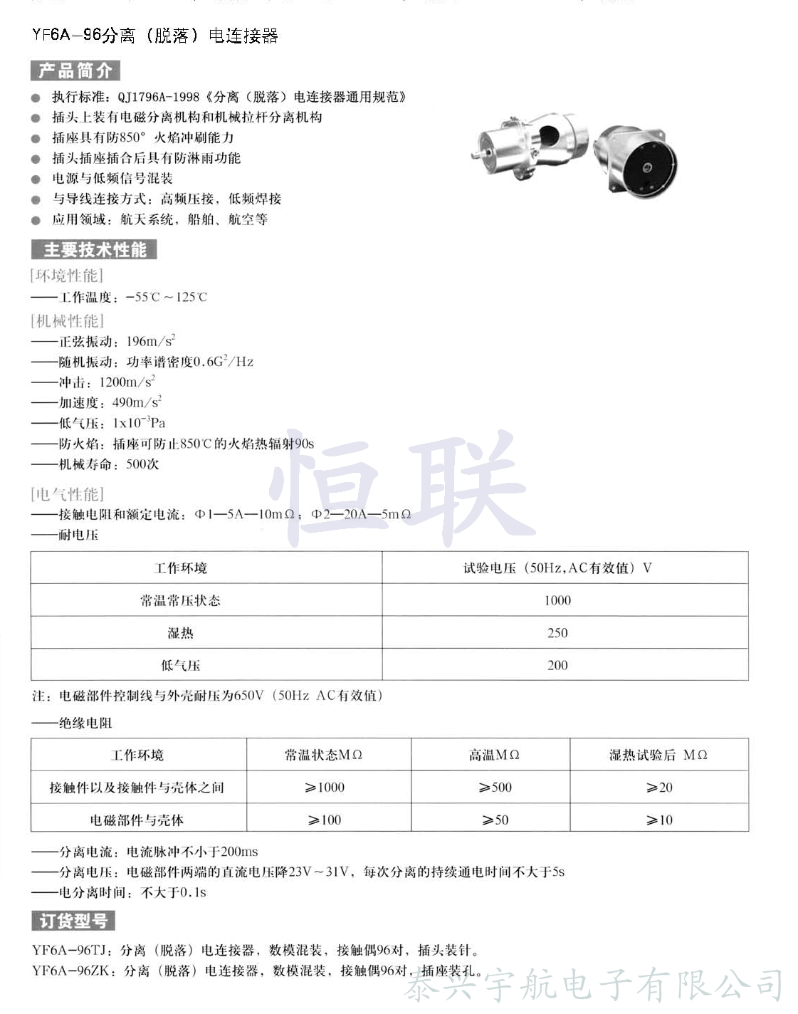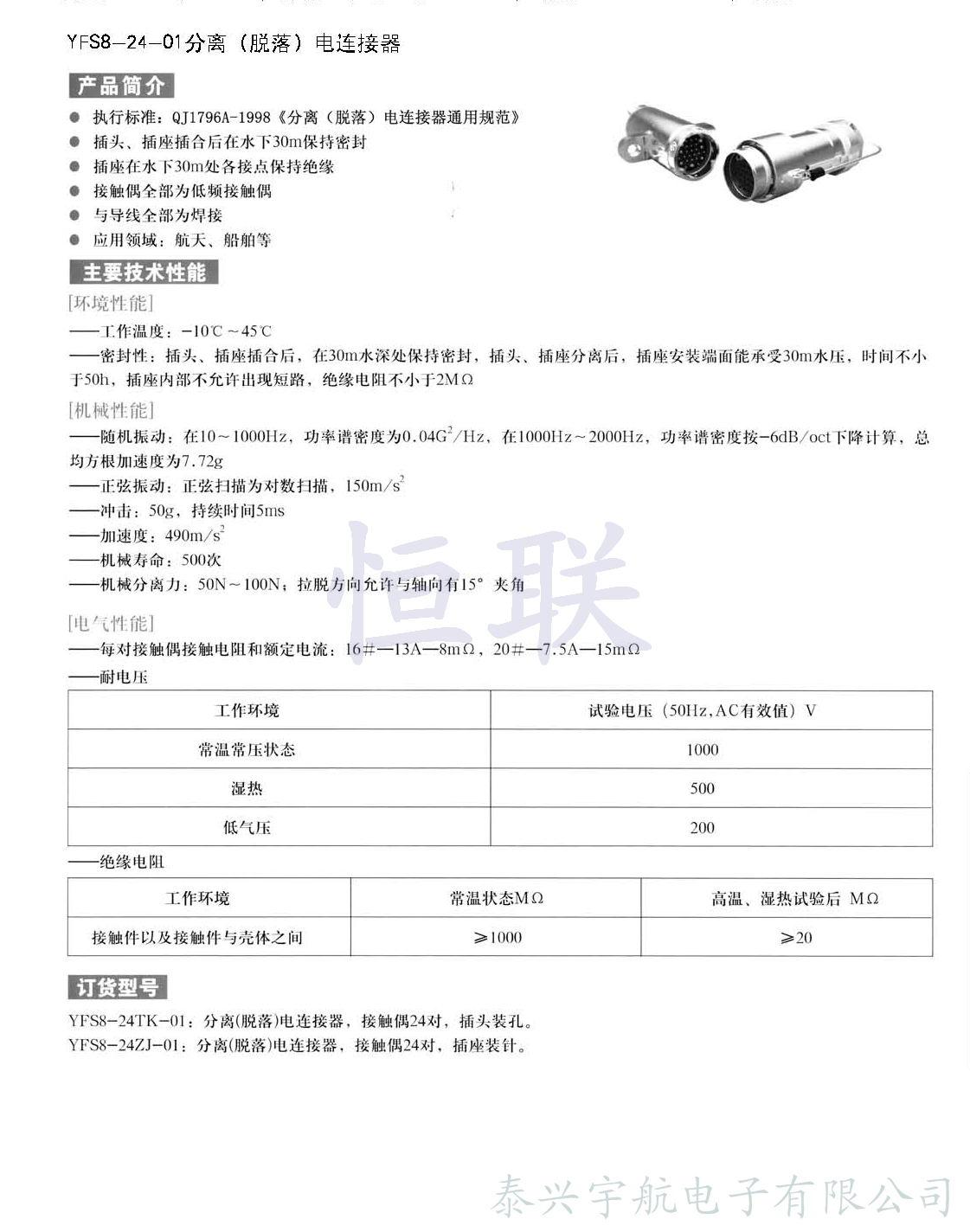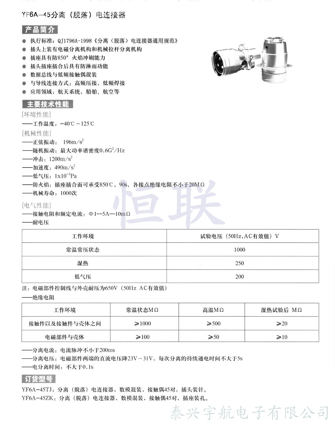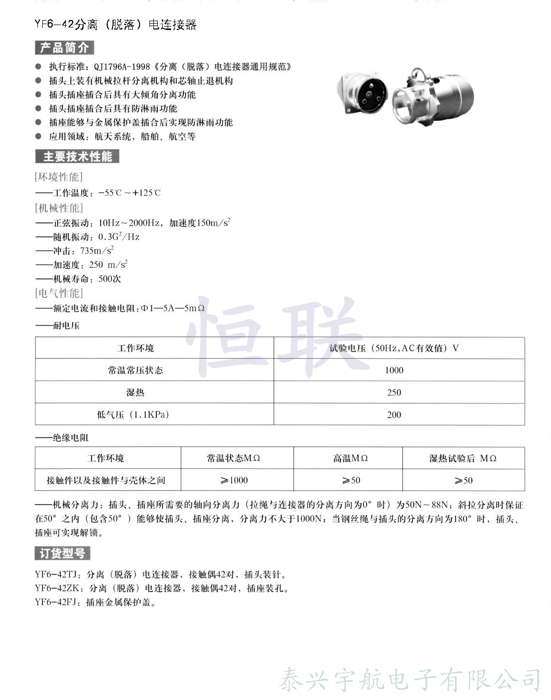 YF型圓形分離電連接器適用于具有小型化要求的戰(zhàn)略戰(zhàn)術(shù)武器系統(tǒng)、航天運載系統(tǒng)的級間電氣線路連接和系統(tǒng)與地面設(shè)備的電路連接,以及其他工業(yè)設(shè)備的電氣連接,并可做瞬間電磁分離和機械分離。