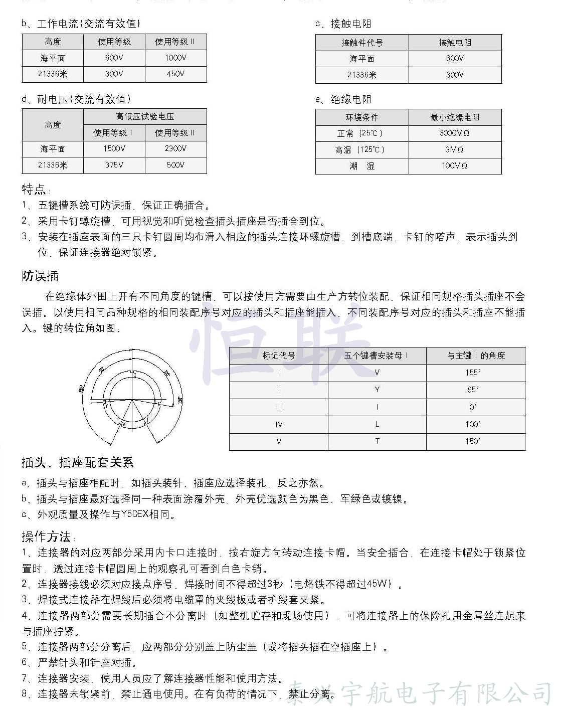 本系列航空插頭包括公制、英制、電源三大類電連接器。均為內(nèi)螺旋槽卡銷鎖緊式。具有快捷連接與分離,體積小、重量輕,密封性能好,抗拉性能優(yōu)之特點(diǎn)。插頭電纜罩有七種安裝方式,殼體分屏蔽與非屏蔽,電纜引出有直式和彎式,端接方式為焊接式。品種多,規(guī)格全。均參照GJB101A—97,GJB598A—96,MIL—C—26482等標(biāo)準(zhǔn)的要求。適用于戰(zhàn)略、戰(zhàn)術(shù)系統(tǒng),野外作業(yè)等電訊號、電能的連接。