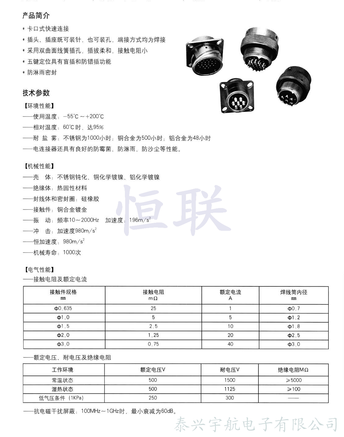 該系列電連接器采用卡口式快速連接和分離,操作方便、連接可靠、五鍵定位,具有盲插和防誤插功能,接觸件采用高可靠的雙曲面線簧插孔,具有插拔柔和、接觸電阻小的特點(diǎn)。該系列電連接器插頭插座均為壓接,廣泛應(yīng)用于潮濕、浸水等惡劣環(huán)境下的設(shè)備與電纜、電纜與電纜之間的電氣連接。
