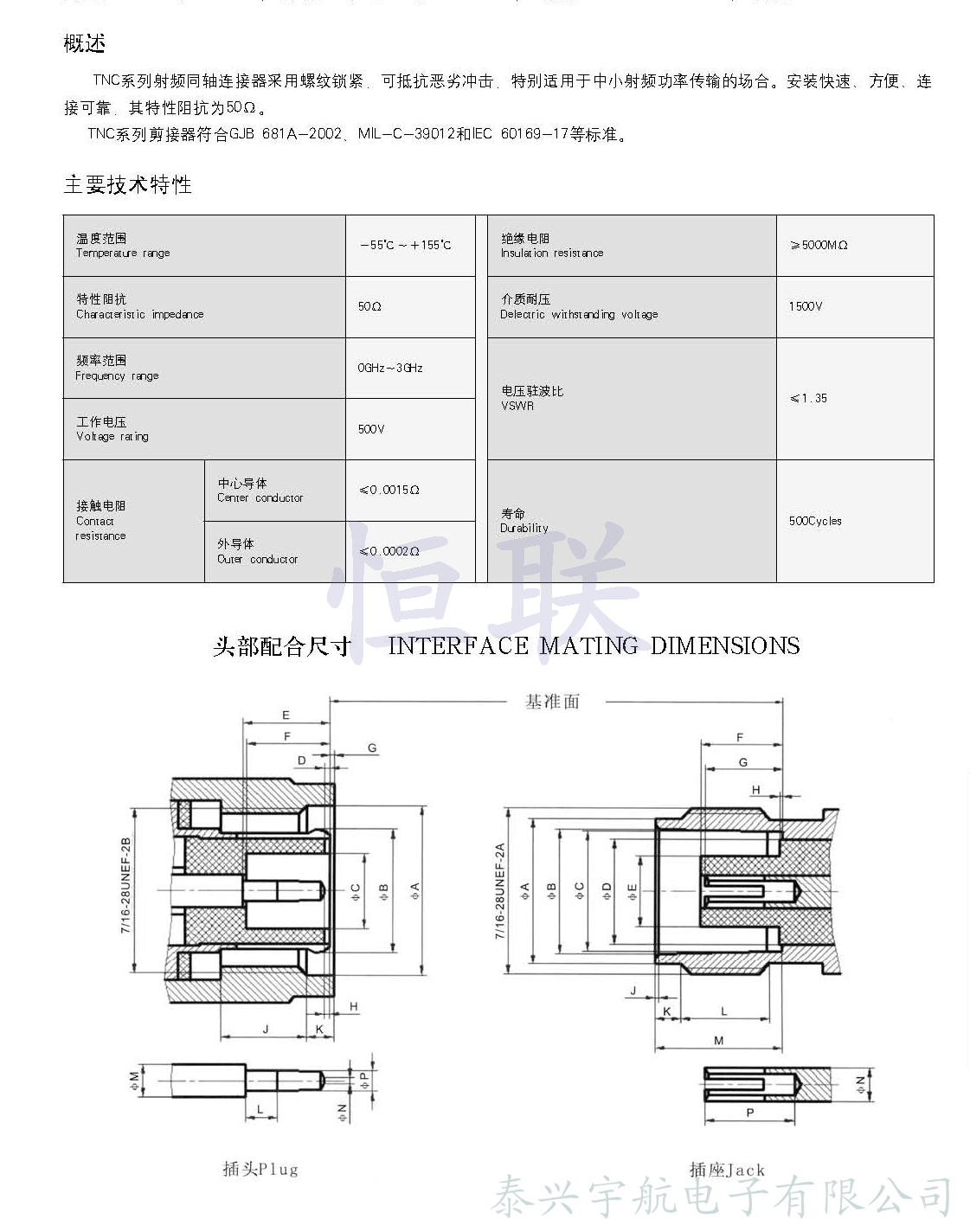 NC系列產(chǎn)品是按照美軍標(biāo)MIL-C-39012研制生產(chǎn)的一種有螺紋連接機(jī)構(gòu)的中小功率連接器。它具有抗振性強(qiáng)、可靠性高、機(jī)械和電氣性能優(yōu)良等特點(diǎn),廣泛地應(yīng)用于無(wú)線電設(shè)備和電子儀器中連接射頻同軸電纜。該系列產(chǎn)品能與國(guó)際上TNC系列射頻同軸連接器相應(yīng)產(chǎn)品進(jìn)行互換。