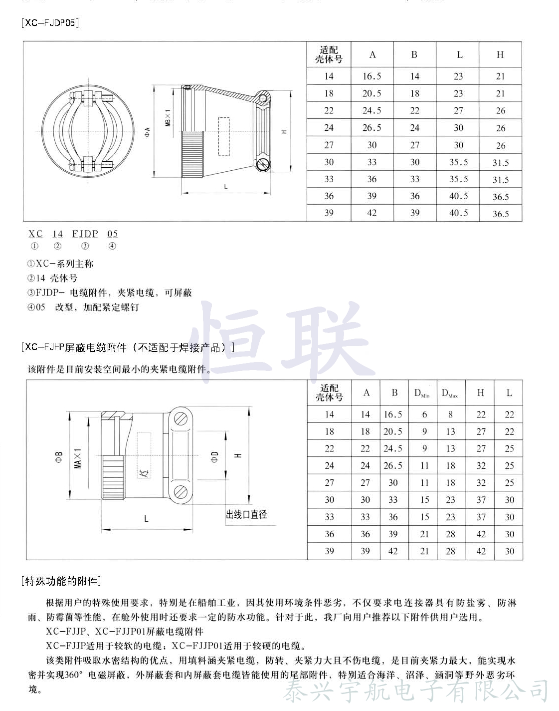 XC系列電連接器除插座、插頭已配直式屏蔽帽及直式彎式電纜夾外,為了擴(kuò)大XC系列電連接器的使用范圍,方便用戶,還配有下列專用附件,可供使用單位選擇。