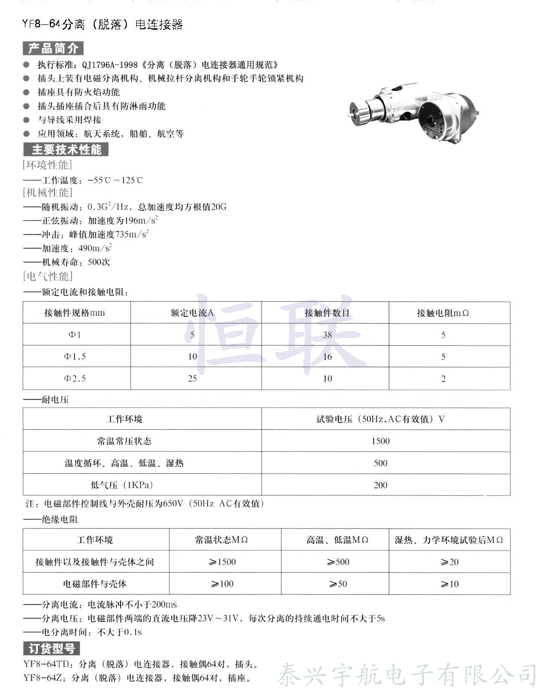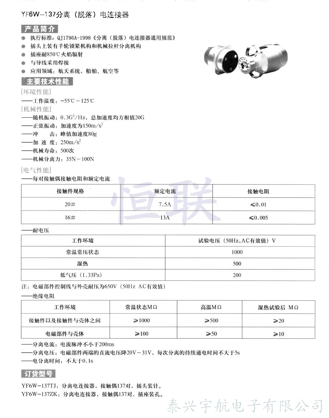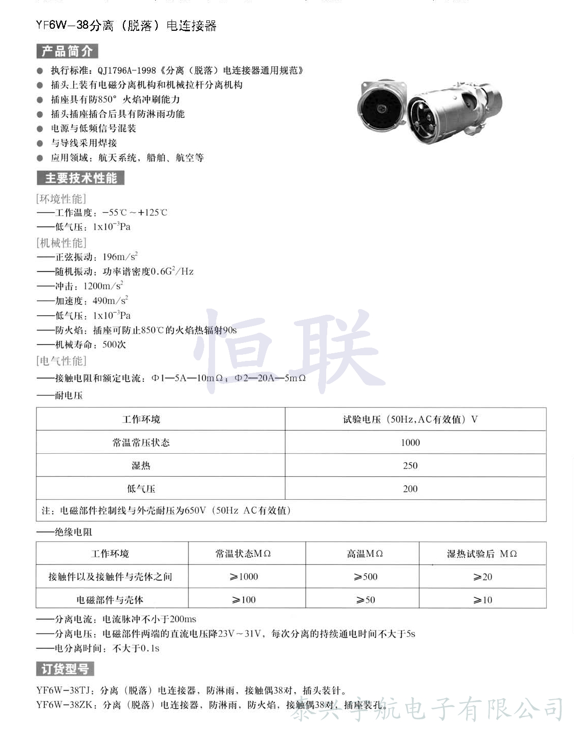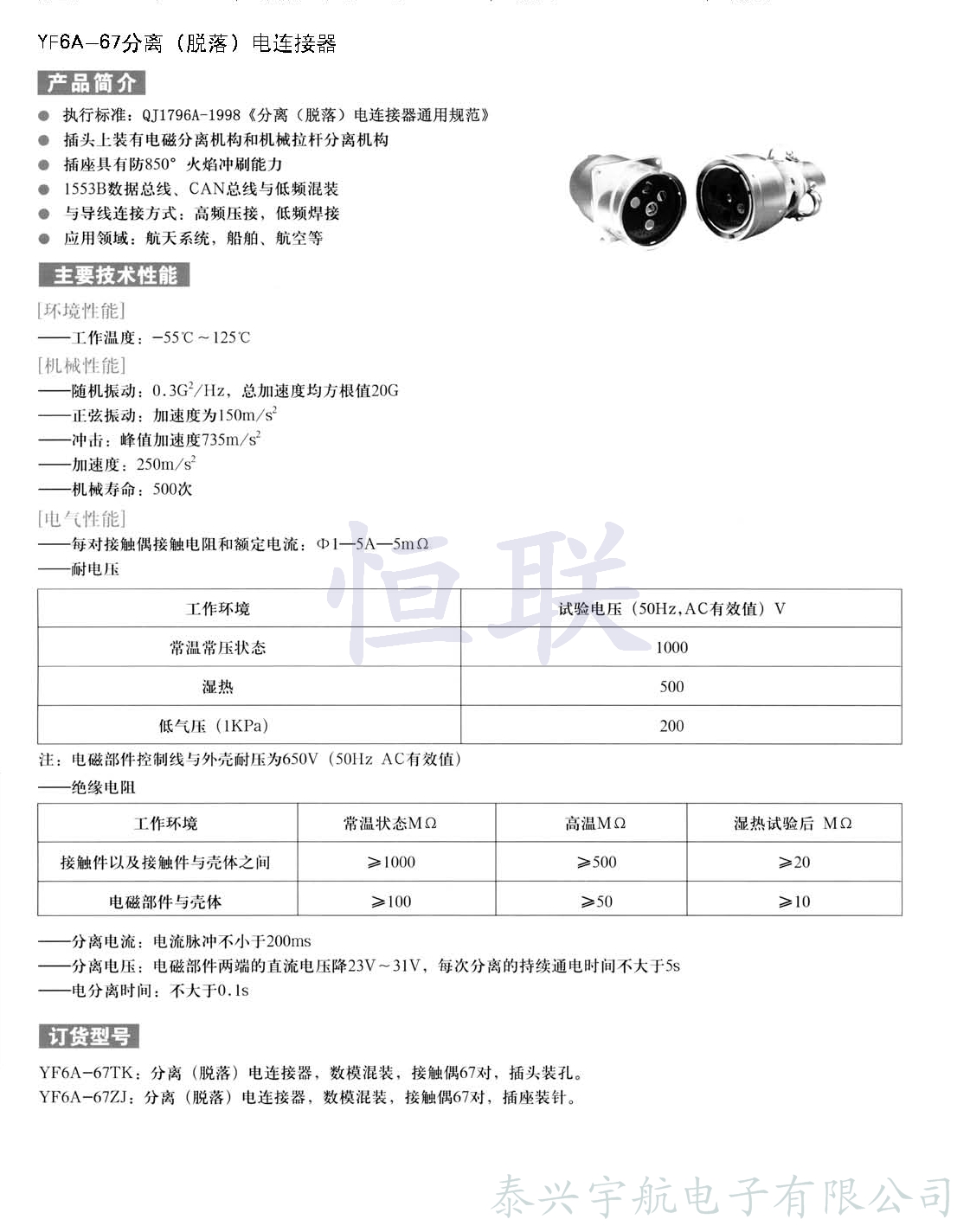 YF型圓形分離電連接器適用于具有小型化要求的戰(zhàn)略戰(zhàn)術(shù)武器系統(tǒng)、航天運載系統(tǒng)的級間電氣線路連接和系統(tǒng)與地面設(shè)備的電路連接,以及其他工業(yè)設(shè)備的電氣連接,并可做瞬間電磁分離和機械分離。
