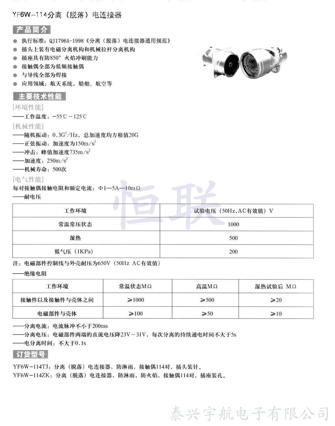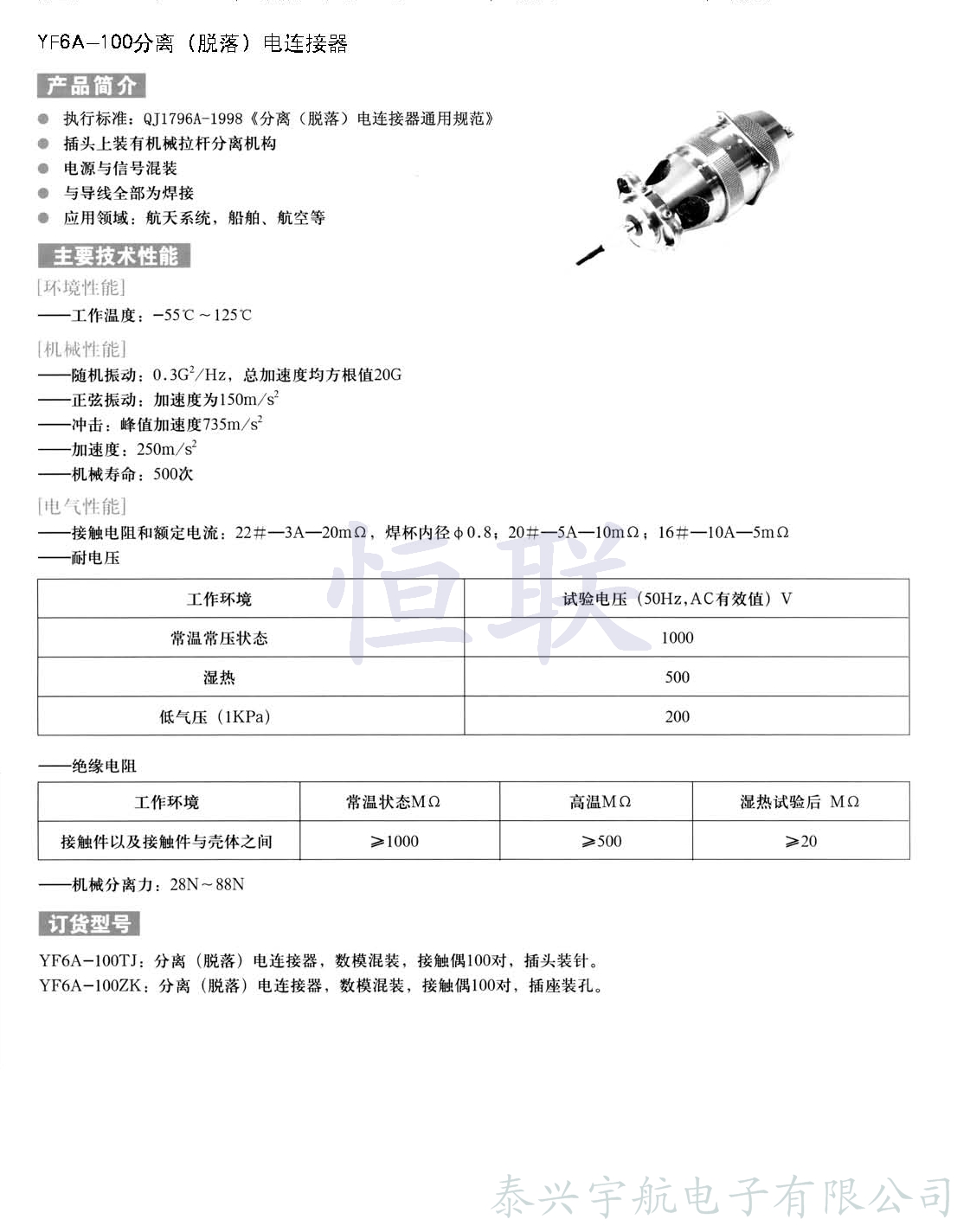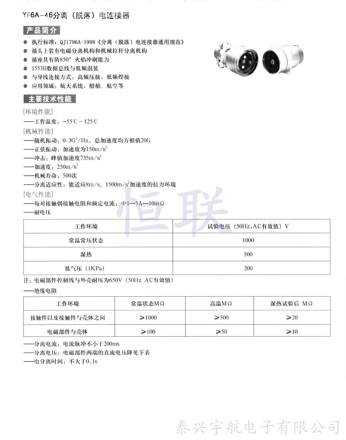 YF型圓形分離電連接器適用于具有小型化要求的戰(zhàn)略戰(zhàn)術(shù)武器系統(tǒng)、航天運載系統(tǒng)的級間電氣線路連接和系統(tǒng)與地面設(shè)備的電路連接,以及其他工業(yè)設(shè)備的電氣連接,并可做瞬間電磁分離和機械分離。