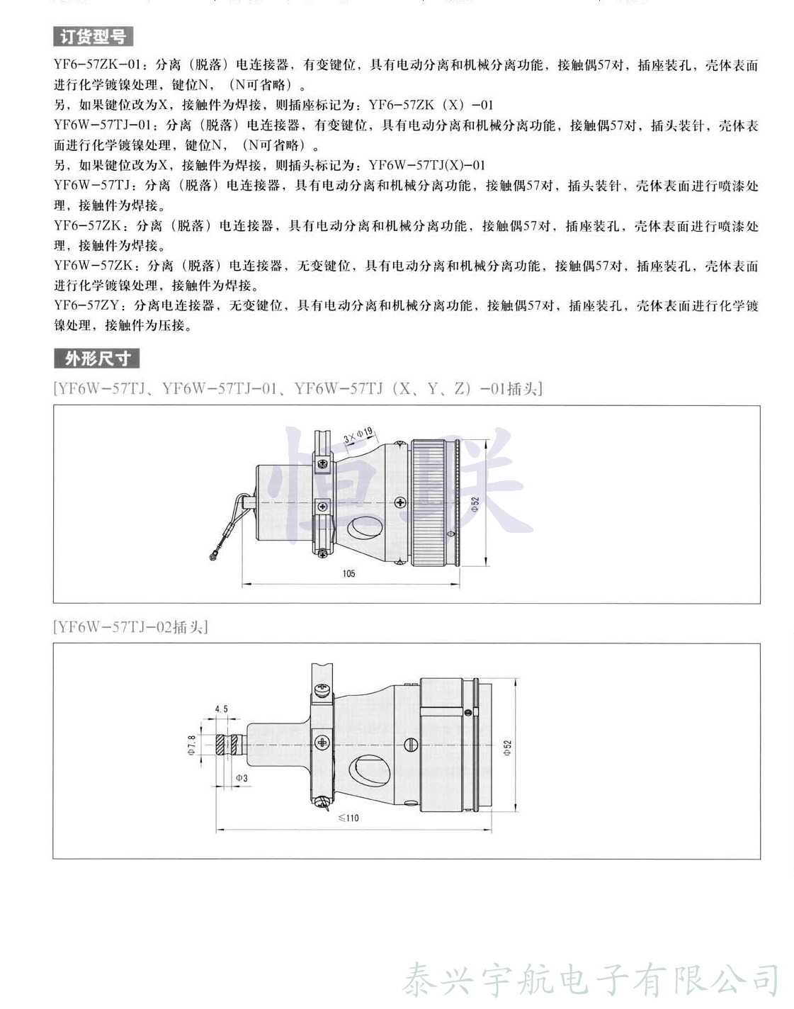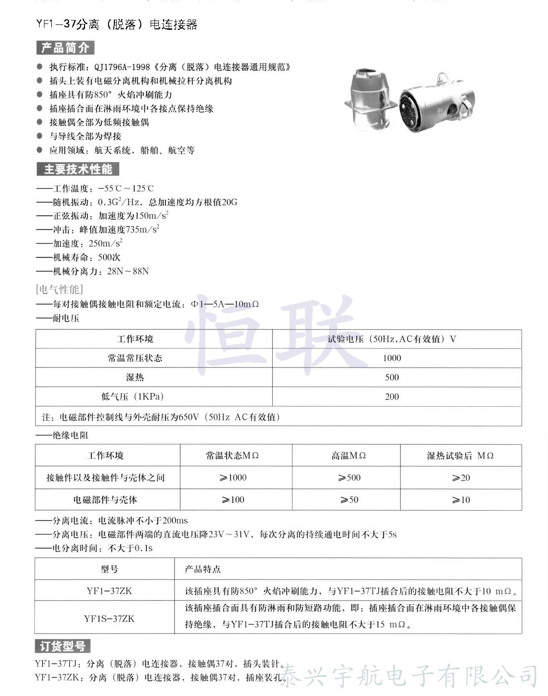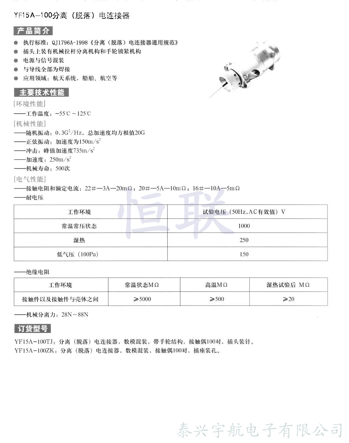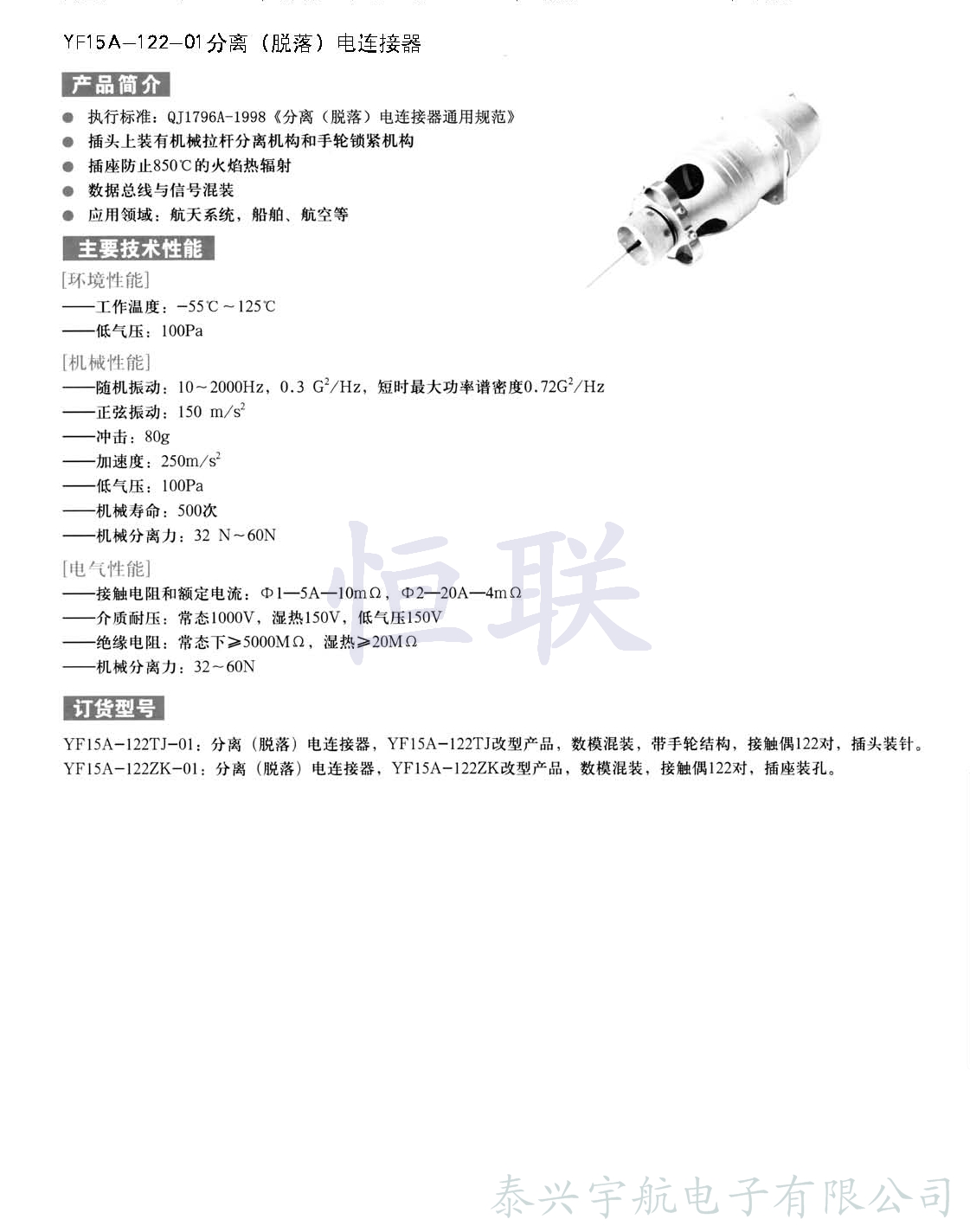 YF型圓形分離電連接器適用于具有小型化要求的戰(zhàn)略戰(zhàn)術(shù)武器系統(tǒng)、航天運載系統(tǒng)的級間電氣線路連接和系統(tǒng)與地面設(shè)備的電路連接,以及其他工業(yè)設(shè)備的電氣連接,并可做瞬間電磁分離和機械分離。